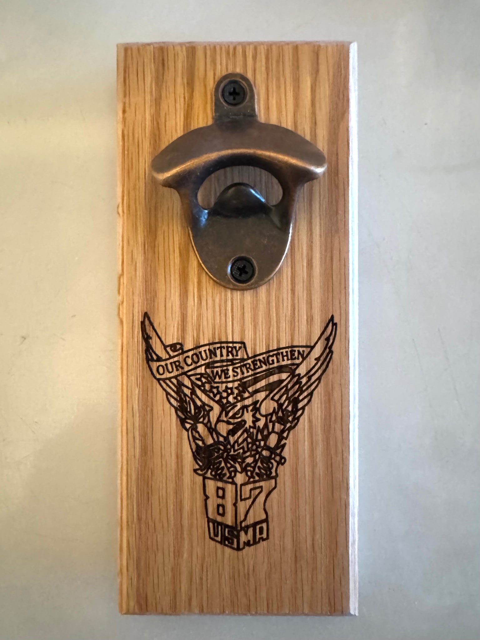 Hand crafted bottle opener with West Point class crests.  This bottle opener has industrial strength magnets that will attach to your refrigerator and remain attached even as you use it to crack open a cold one.  It also has a hidden magnet to catch the cap and prevent it from hitting the floor.